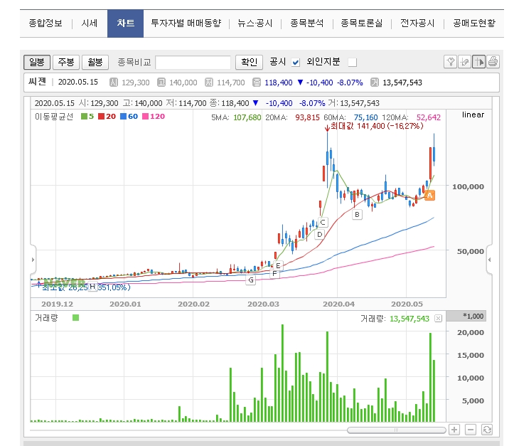이미 2차례 정도의 큰 폭등이 있었던 챠트를 보면